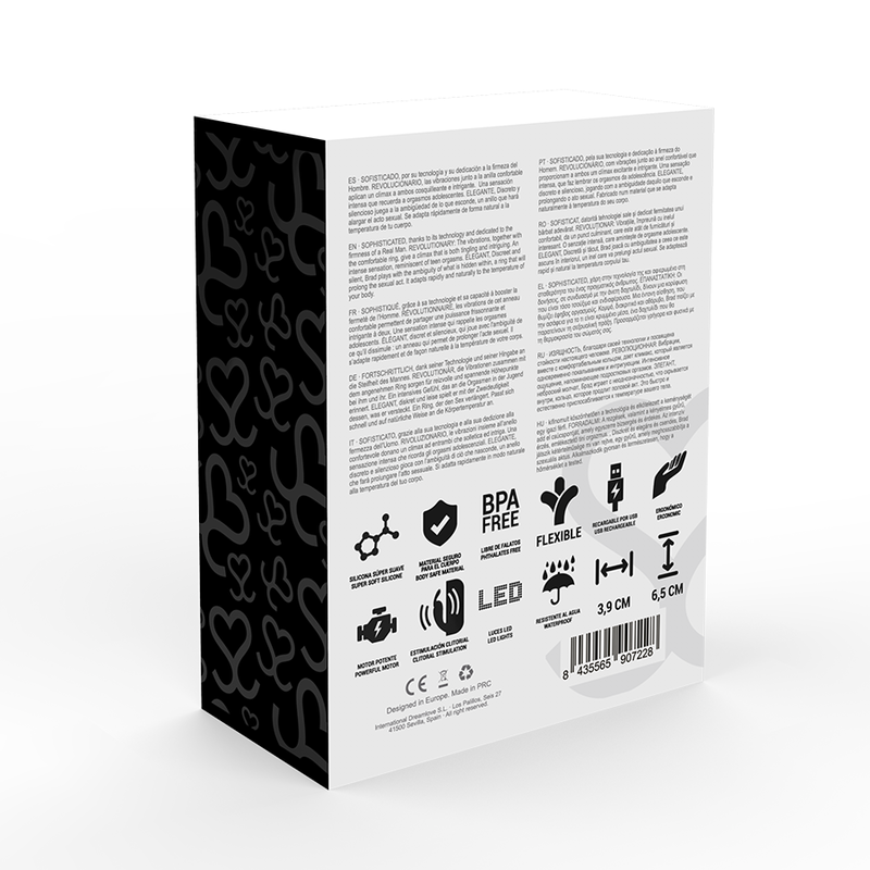 - Dank seines flexiblen Rings lässt sich Brad einfach platzieren. Positionieren Sie Brad einfach an der Basis des Penis und aktivieren Sie die Rotation mit dem oberen Knopf, der auf einzigartige Weise für eine Stimulation der Klitoris sorgt.